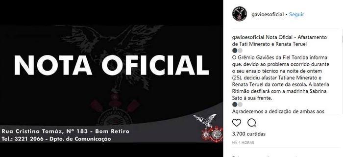 "O Grêmio Gaviões da Fiel Torcida informa que, devido ao problema ocorrido durante o seu ensaio técnico na noite de ontem (25), decidiu afastar Tatiane Minerato e Renata Teruel da corte da escola. A bateria Ritimão desfilará com a madrinha Sabrina Sato à sua frente. Agradecemos a dedicação de ambas aos Gaviões, mas a postura demonstrada ontem não condiz com os princípios da escola, que se dedica a levar à avenida um Carnaval perfeito tecnicamente e cheio de alegria.Fizemos um ensaio excelente e vibrante, e seguimos fortes rumo ao Carnaval, certos de que caminhamos lado a lado com a Fiel Torcida para a realização de um desfile inesquecível", dizia a nota oficial da diretoria da Gaviões. O comunicado foi publicado no site da agremiação e também em suas redes sociais.