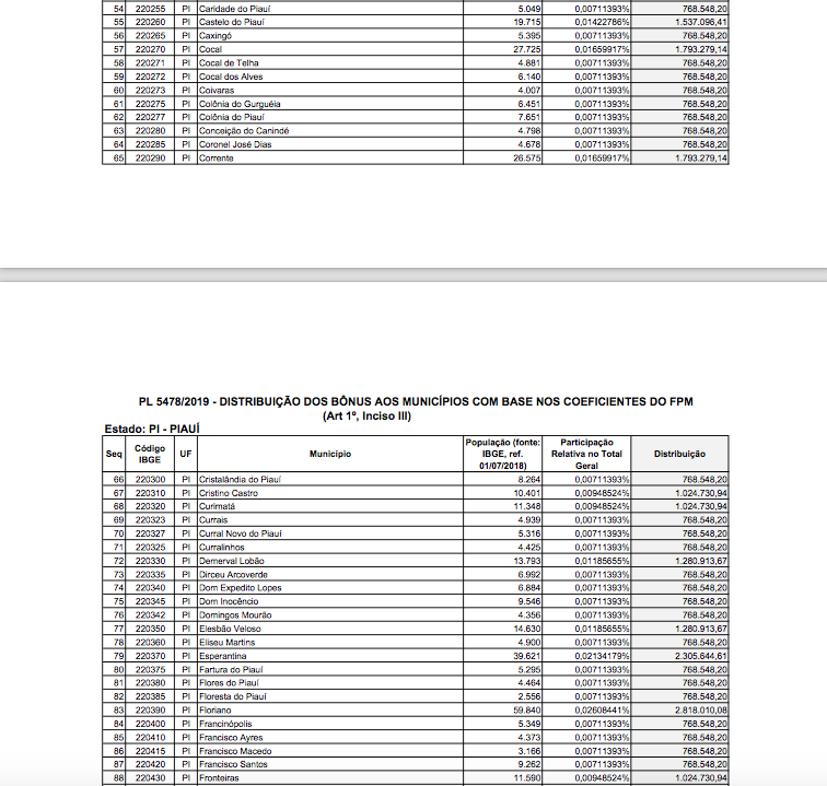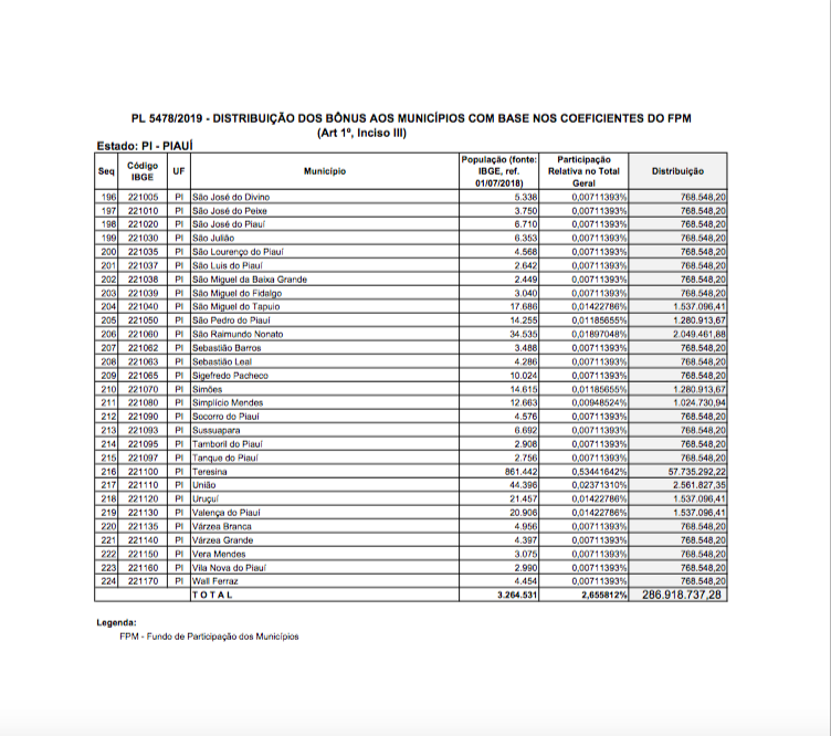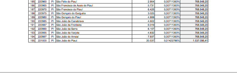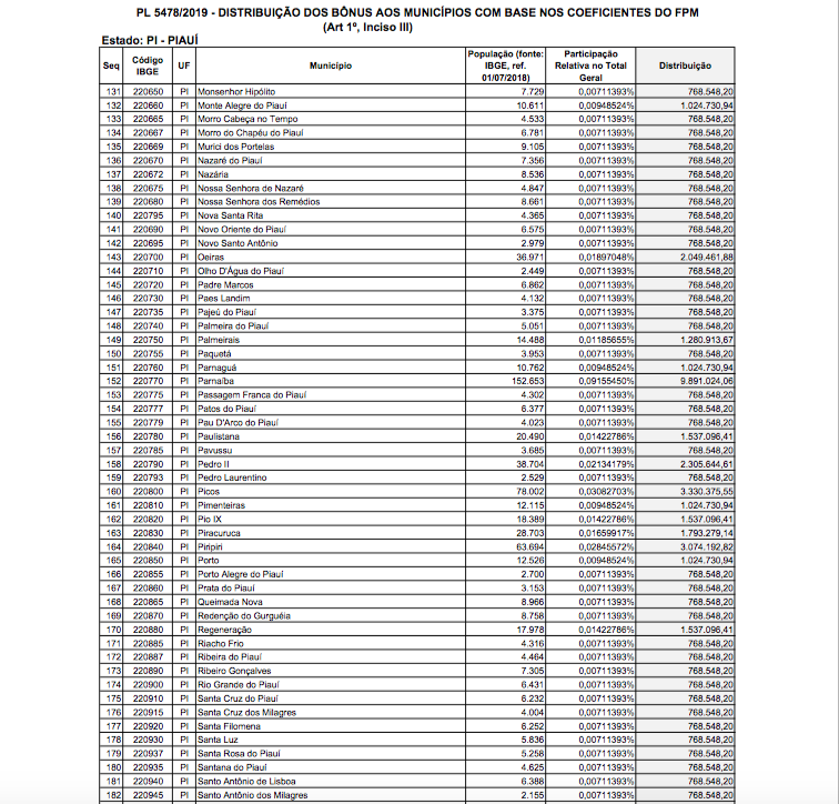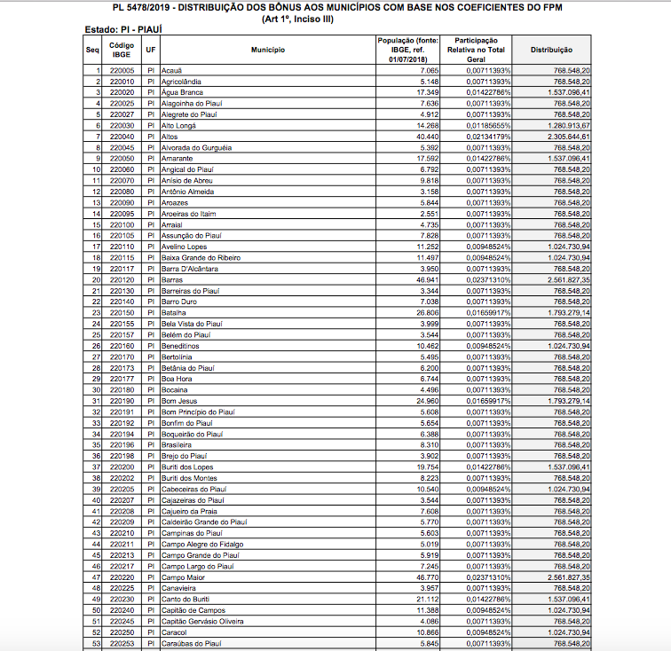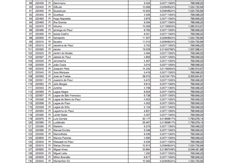 Confira abaixo os valores para cada cidade do Piauí: