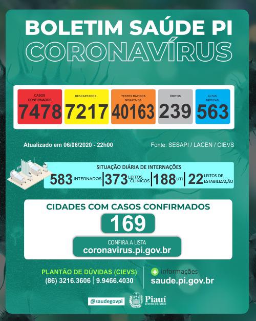 No Piauí, o total de mortes subiu para 239 após mais 15 óbitos serem registrados em 24 horas, segundo boletim divulgado na noite deste sábado (06) pela Secretaria de Estado da Saúde do Piauí (SESAPI). O Estado possui 7.217 casos descartados e 40.163 testes rápidos negativos. São 583 internados (373 leitos clínicos, 188 em UTI e 22 em leitos de estabilização) e 563 altas.