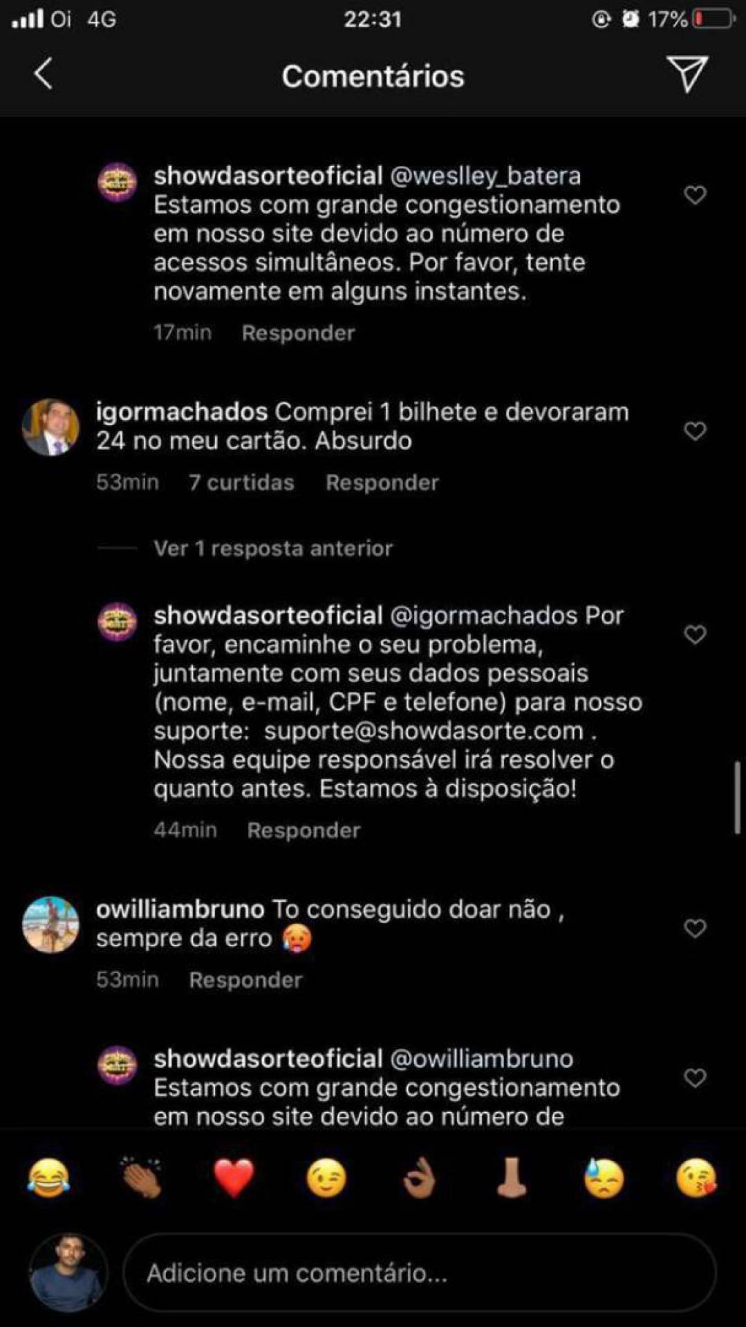 Em questão de minutos, surgiram as primeiras reclamações sobre o erro na fatura e a empresa Show da Sorte começou a responder e esclarecer sobre a cobrança indevida. Com o tempo, o volume de críticas cresceu bastante e os comentários da publicação foram desativados deixando os internautas revoltados.