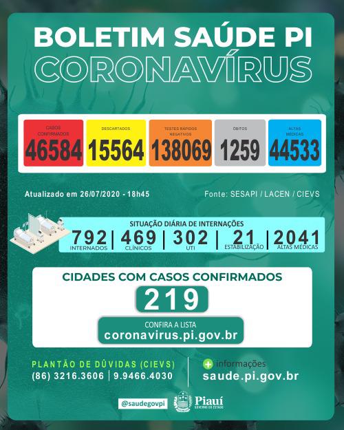 O Piauí registrou 16 mortes e 540 novos casos de coronavirus nas últimas 24 horas, mostrou o boletim epidemiológico divulgado na noite deste domingo (26) pela Secretaria de Saúde. O total de óbitos subiu para 1.259 e os casos confirmados saltaram de 46.044 para 46.584 no Estado.