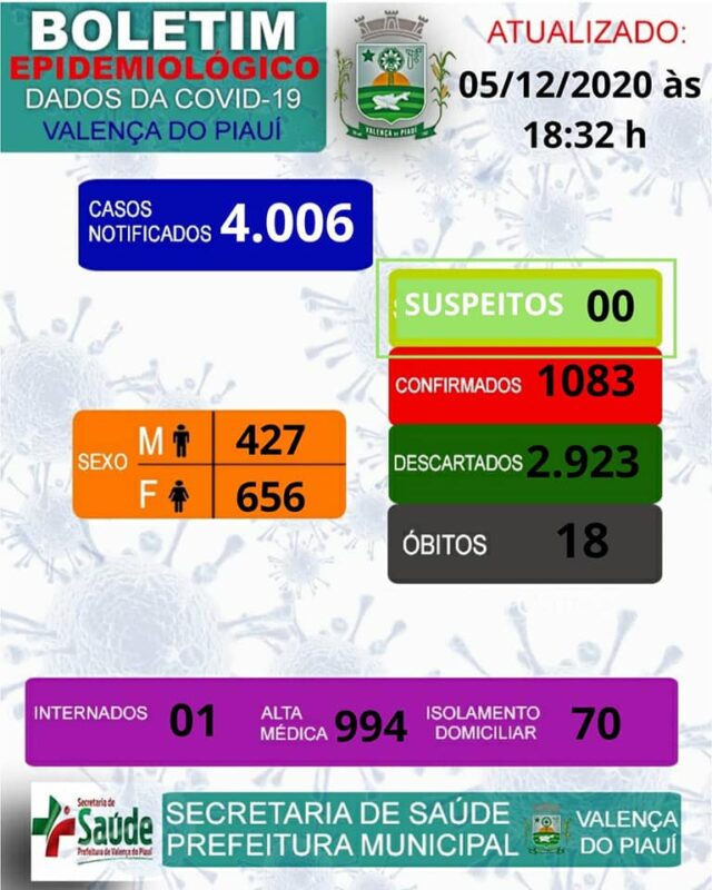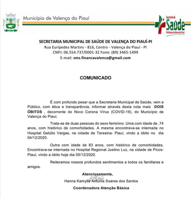 Uma veio a óbito no Hospital Getúlio Vargas na sexta-feira (04) em Teresina e outra no Hospital Justino Luz em Picos neste sábado, 05 de dezembro. Os casos confirmados em Valença chegaram a marca de 1.083 pessoas infectadas desde o início da pandemia.