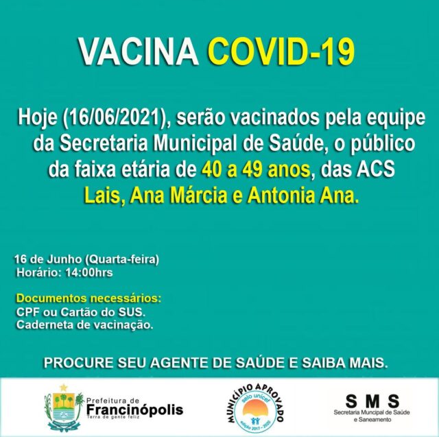 A Prefeitura de Francinópolis, através da Secretaria Municipal de Saúde, vacinou nesta terça-feira, 15 de junho, os servidores da Secretaria Municipal de Assistência Social e às 14h desta quarta-feira (16), inicia a vacinação contra a covid-19 para o público entre 40 e 49 anos.