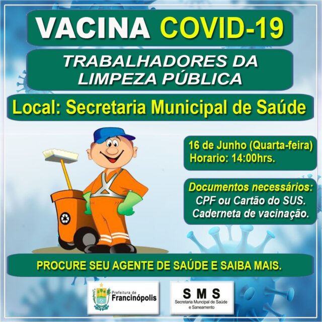 Ainda nesta quarta-feira serão também imunizados os Trabalhadores da Limpeza Pública. Ela pede que as pessoas desses grupos não esqueçam de levar o CPF ou Cartão do Sus e a Caderneta de Vacinação. A vacinação acontece no posto na sede da Secretaria Municipal de Saúde.