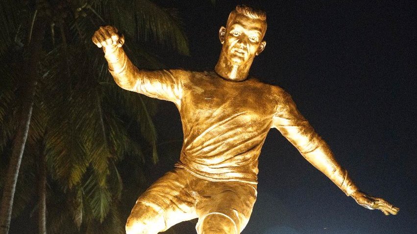 A estátua de Cristiano Ronaldo erguida em Goa, na Índia, vem causando polêmica no estado indiano. A escultura tem como objetivo incentivar os mais jovens a praticar futebol, porém os locais não estão satisfeitos com a homenagem ao português justamente nos 60 anos da independência de Goa de Portugal.