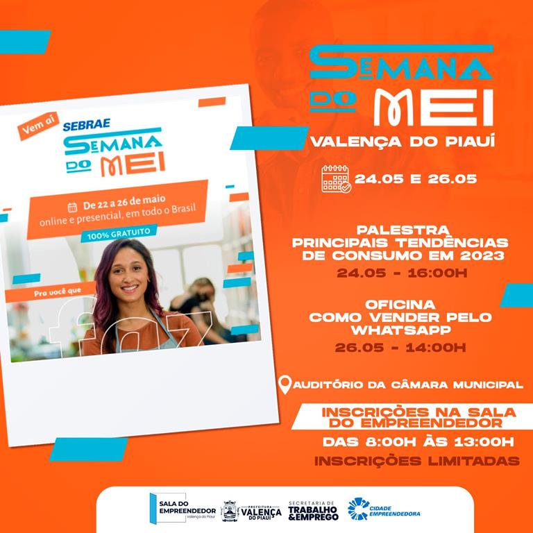 A Secretaria de Trabalho e Emprego de Valença do Piauí vai promover através da Sala do Empreendedor, a Semana do MEl. O evento vai acontecer nos dias 24 e 26 de maio no auditório da Câmara Municipal.