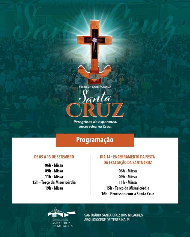 Com o tema “Peregrinos da Esperança, Ancorados na Cruz”, a programação deste ano contará com missas diárias às 6h, 9h, 11h e 19h, além do Terço da Misericórdia, sempre às 15h. O ponto alto das celebrações será o encerramento no dia 14 de setembro, quando acontece a grande procissão às 16h pelas ruas da cidade, momento mais esperado pelos fiéis e peregrinos.