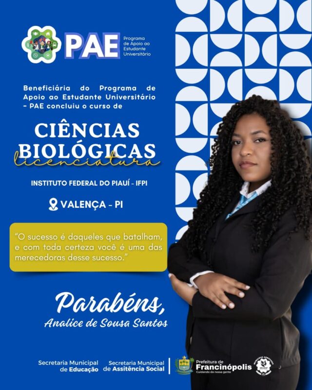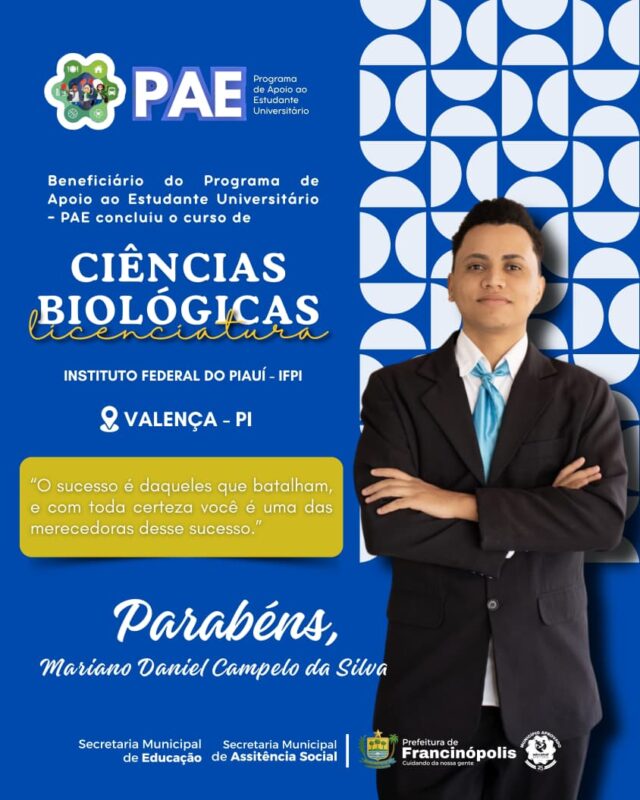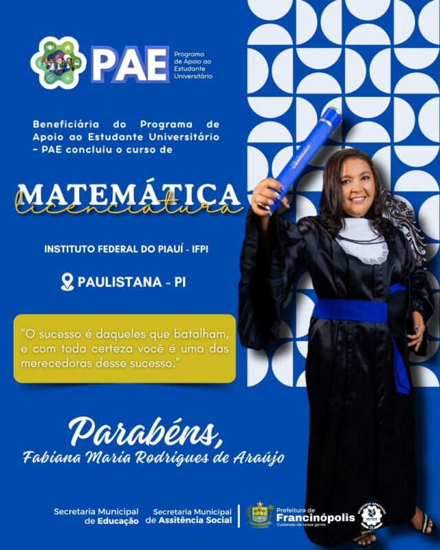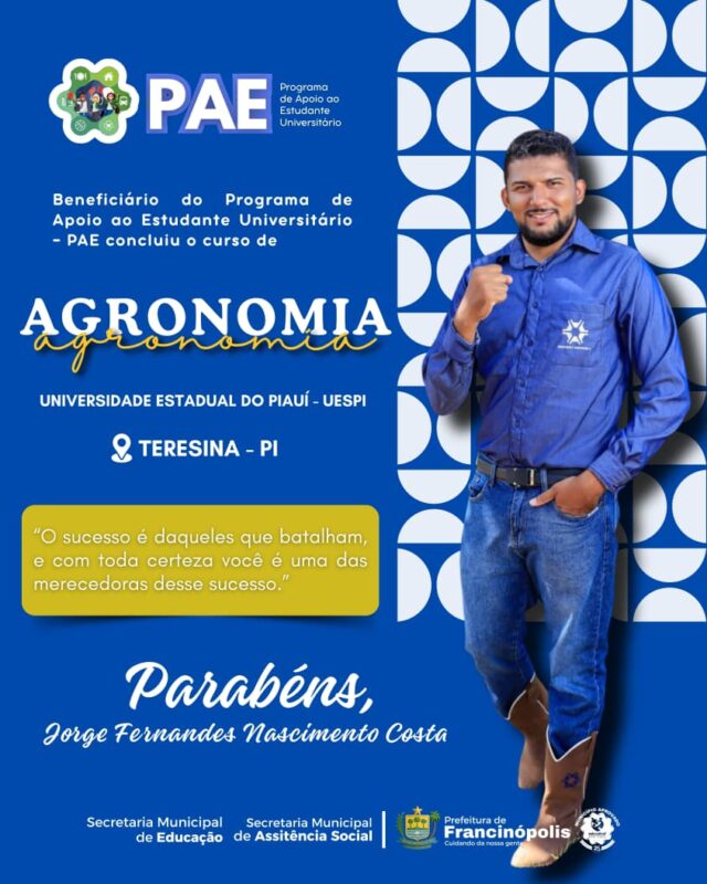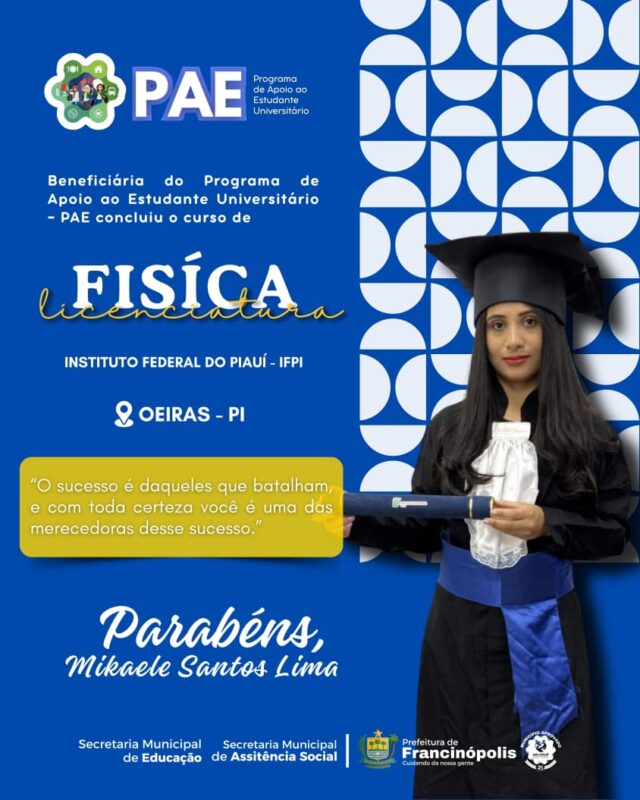 O Programa de Apoio ao Estudante Universitário é um dos principais investimentos da atual gestão na área da educação, garantindo que jovens do município possam cursar o ensino superior com mais segurança, dignidade e incentivo. Com o PAE, a Prefeitura reafirma seu compromisso com a formação acadêmica e o futuro dos filhos da terra, fortalecendo o desenvolvimento humano e social do município.